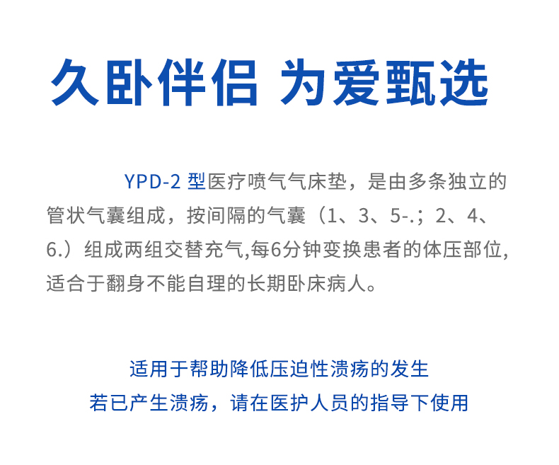 - YPD-2系列氣墊床是由20個(gè)單獨(dú)的管狀氣囊組成,按間隔的氣墊(1、3、5……;2、4、6……)組成兩組交替充氣,減輕患者的局部體壓部位的壓力