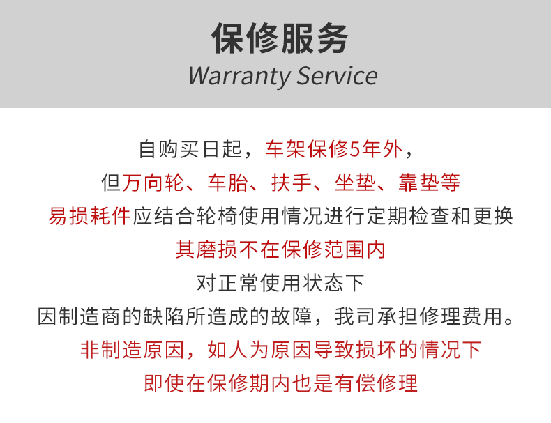 于保修:自購買日起,除了本體車架保修5年外,其他部分保修1年。對正常使用狀態(tài)下,因制造商的缺陷所造成的故障,我司承擔修理費用。但萬向輪、車胎、扶手、坐墊、靠墊等易損耗件應結合輪椅使用情況進行定期檢查和更換,其磨損不在保修范圍內(nèi)。(非制造原因,如人為原因?qū)е聯(lián)p壞的情況下,即使在保修期內(nèi)也是有償修理)