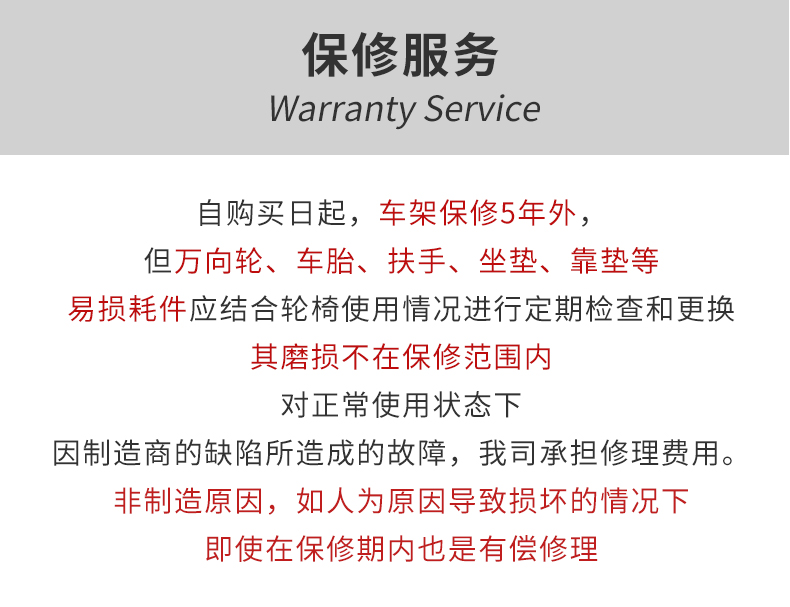 于保修:自購買日起,除了本體車架保修5年外,其他部分保修1年。對正常使用狀態(tài)下,因制造商的缺陷所造成的故障,我司承擔修理費用。但萬向輪、車胎、扶手、坐墊、靠墊等易損耗件應結合輪椅使用情況進行定期檢查和更換,其磨損不在保修范圍內。(非制造原因,如人為原因導致損壞的情況下,即使在保修期內也是有償修理)