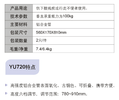 魚躍助行器YU720:供下肢殘疾或行走不便者使用,重量承載能力100公斤