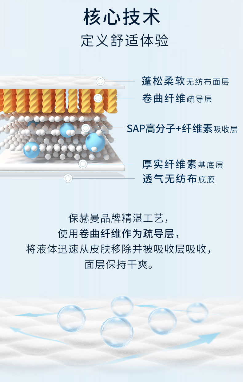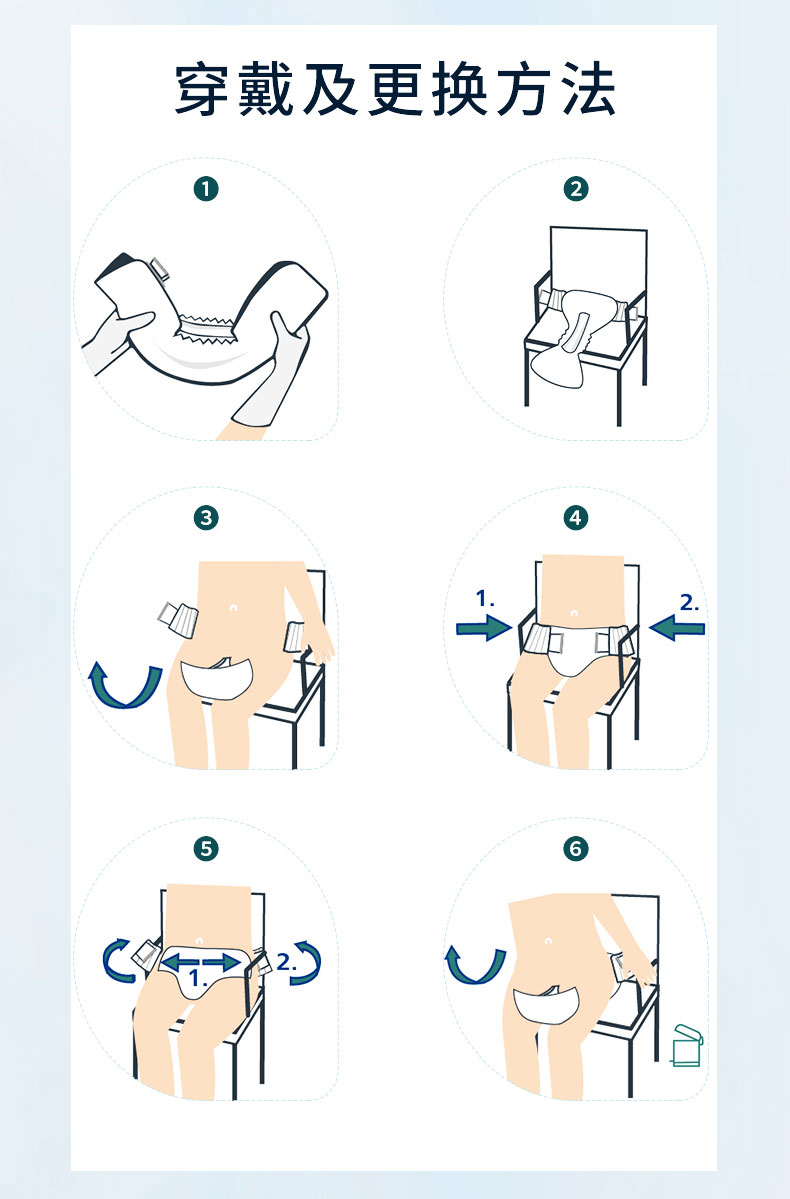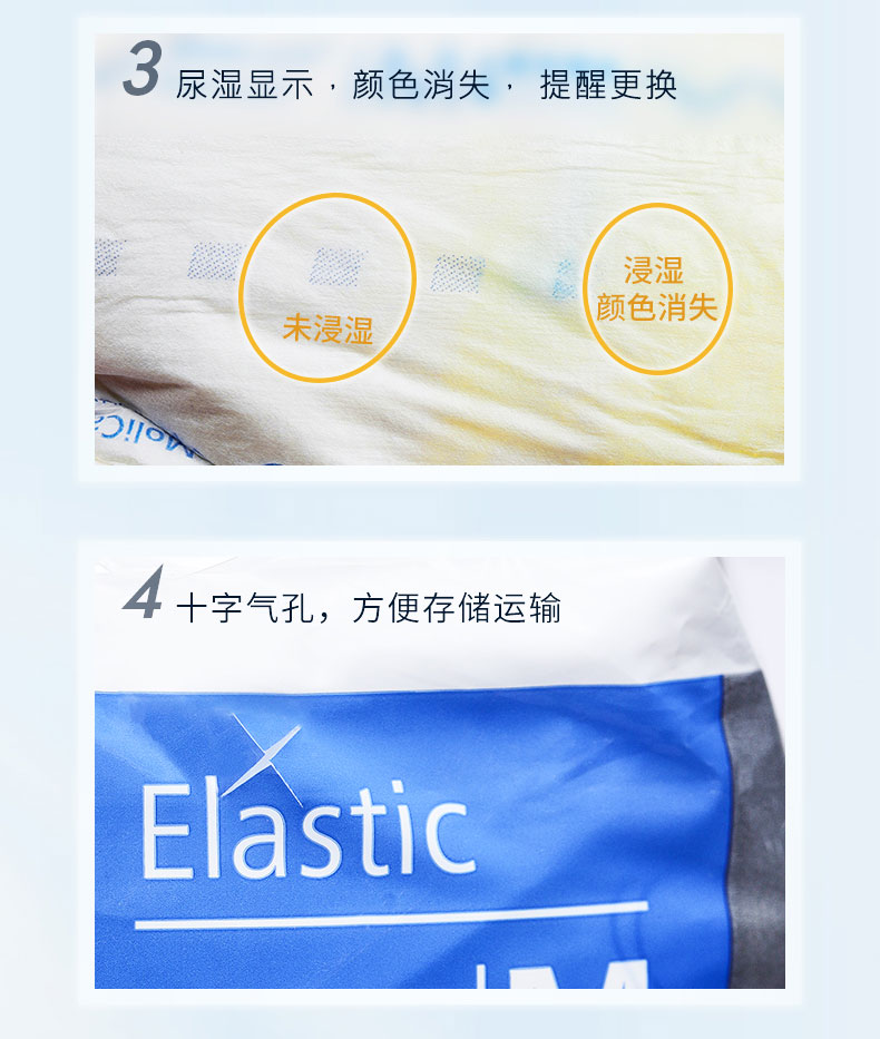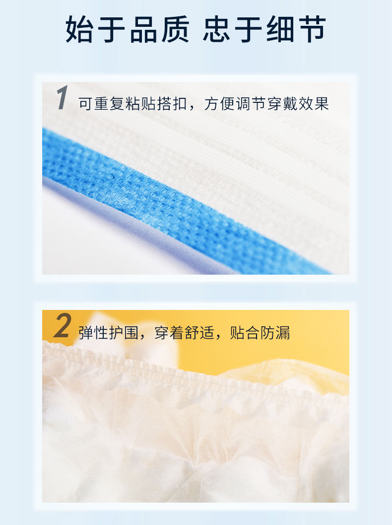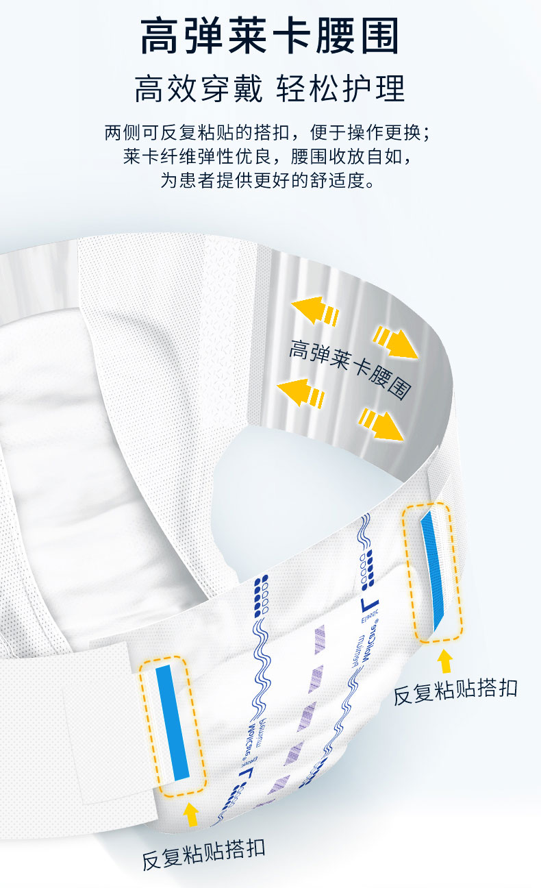 - pH5.5弱酸性保護(hù)皮膚預(yù)防失禁皮炎、三層吸收鎖定、親膚、低敏、透氣性好、速干、低調(diào)、防漏、除臭、可重復(fù)粘貼搭扣、彈性腰圍、穿戴更快。