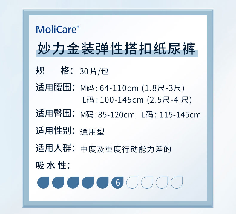 保赫曼妙力金裝彈性搭扣式尿褲(日用型)中號Molicare Pr. Elastic 6D M P30 30片/包 3包/箱