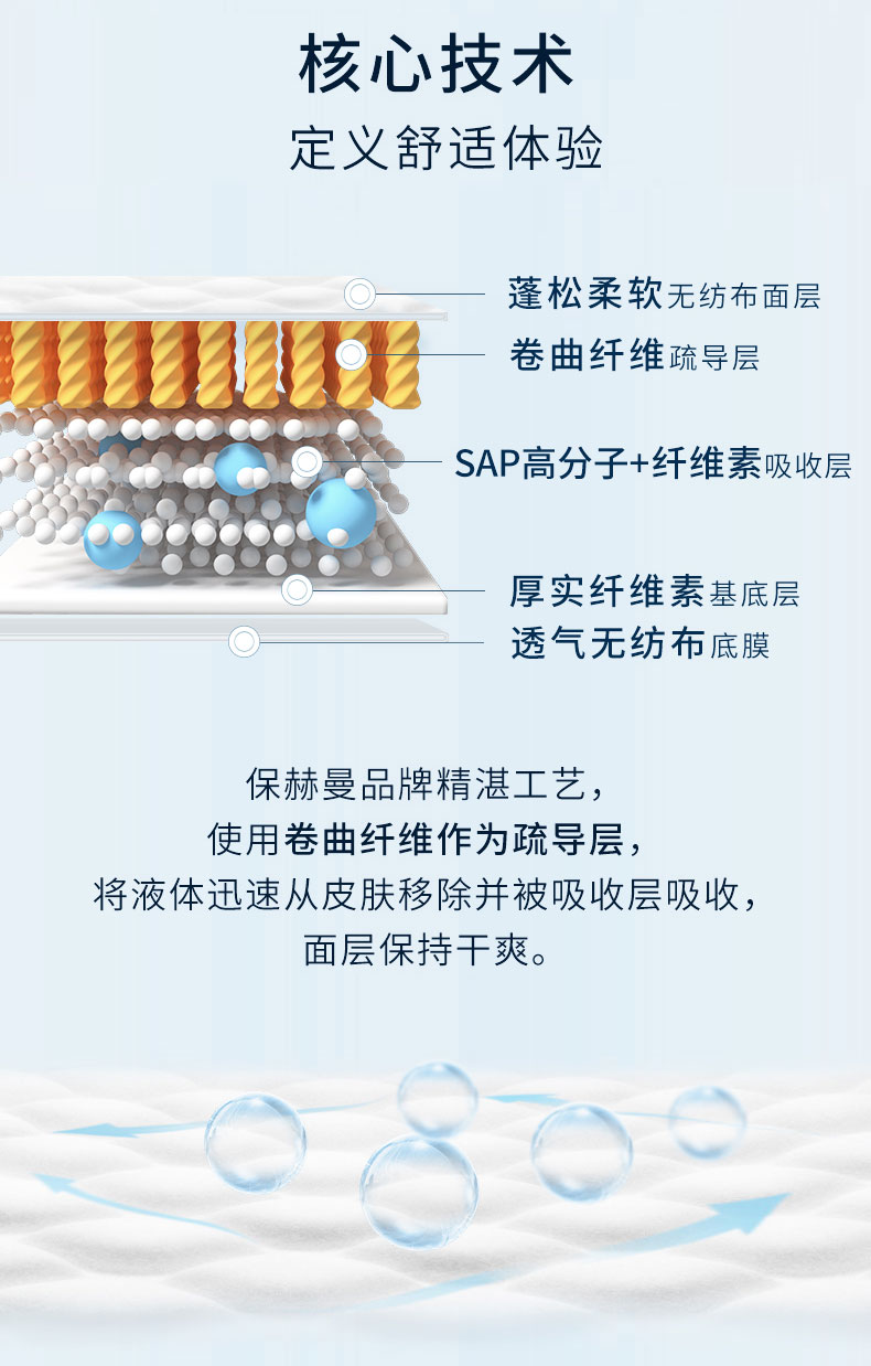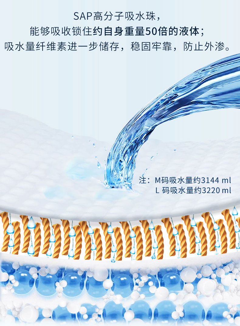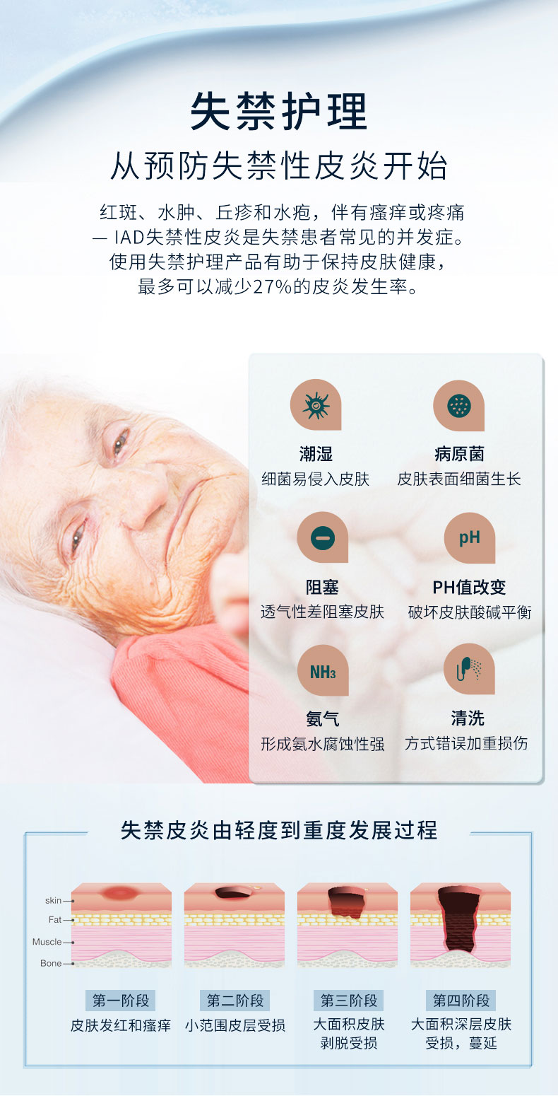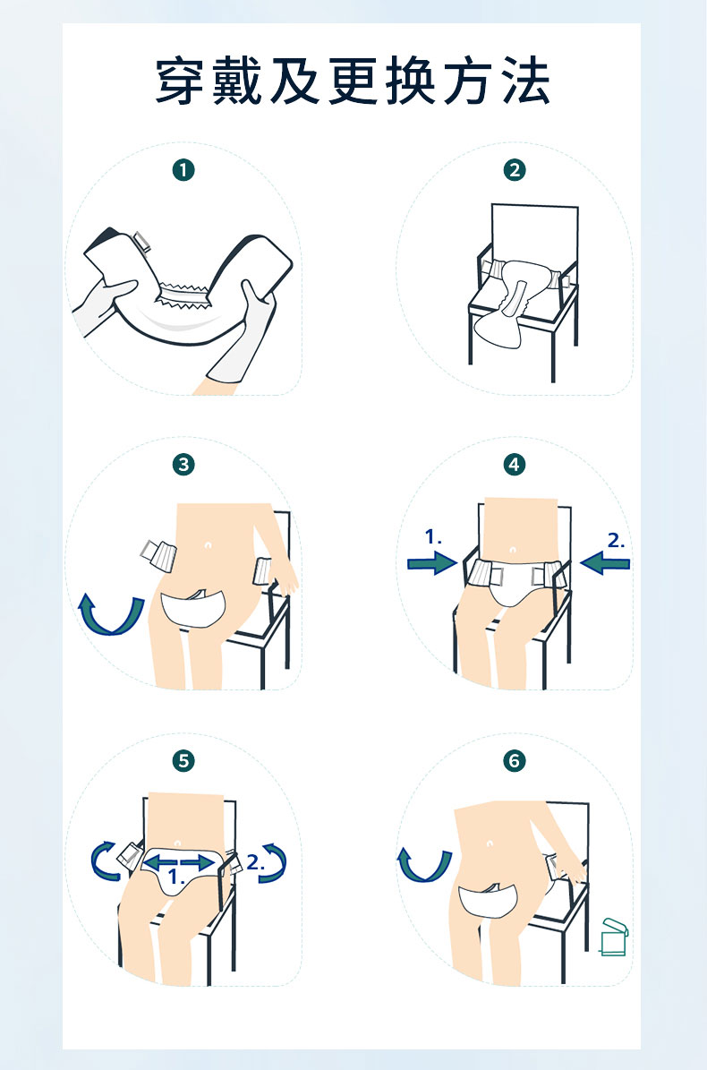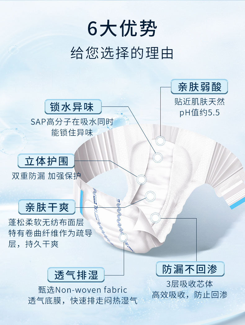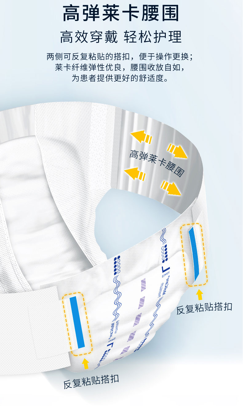 - pH5.5弱酸性保護(hù)皮膚預(yù)防失禁皮炎、三層吸收鎖定、親膚、低敏、透氣性好、速干、低調(diào)、防漏、除臭、可重復(fù)粘貼搭扣、彈性腰圍、穿戴更快。