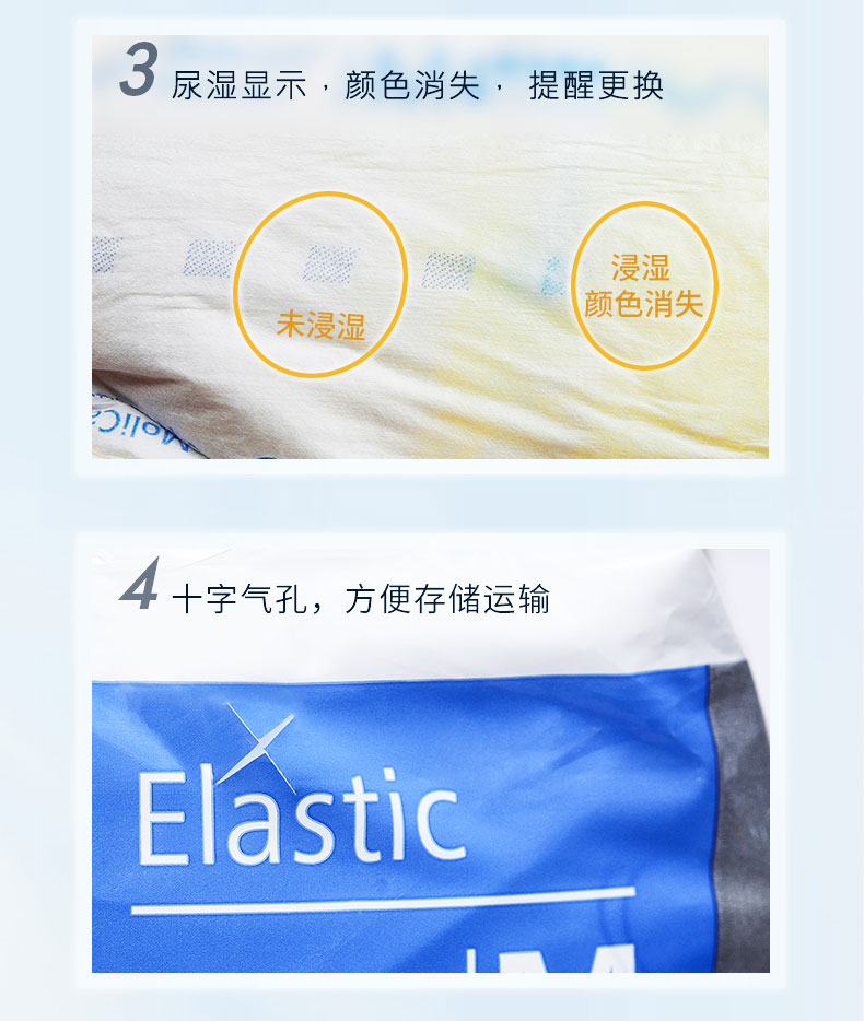 - pH5.5弱酸性保護皮膚預防失禁皮炎、三層吸收鎖定、親膚、低敏、透氣性好、速干、低調(diào)、防漏、除臭、可重復粘貼搭扣、彈性腰圍、穿戴更快。
