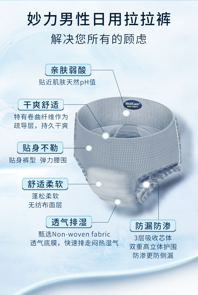 - pH5.5弱酸性保護(hù)皮膚預(yù)防失禁皮炎、三層吸收鎖定、親膚、低敏、透氣性好、速干、低調(diào)、防漏、除臭、貼合男性解剖