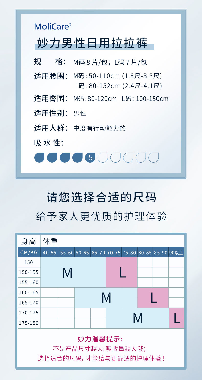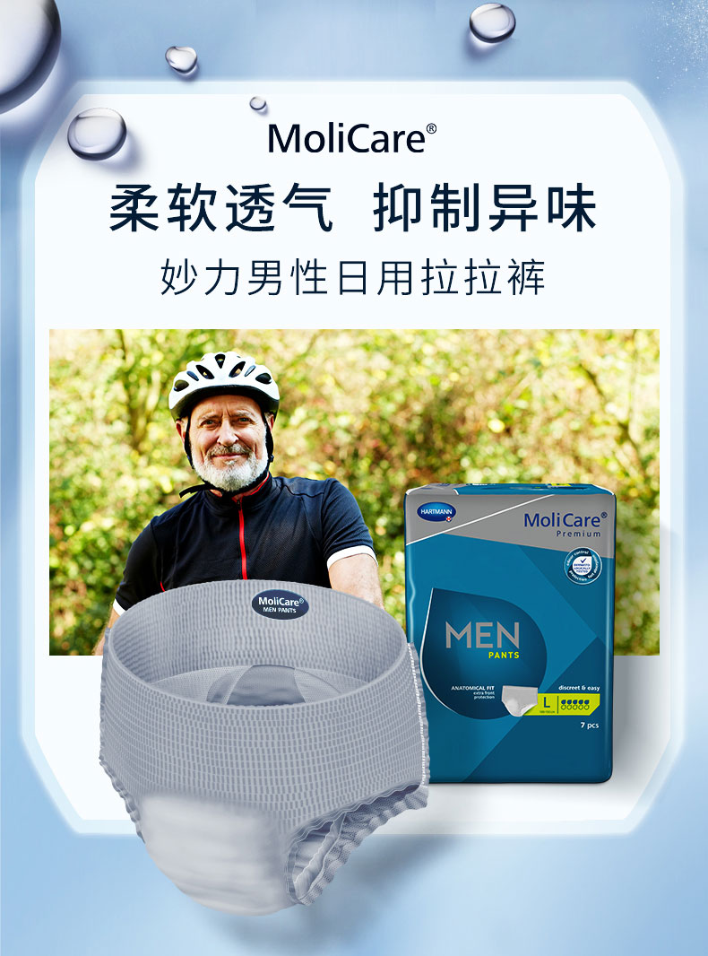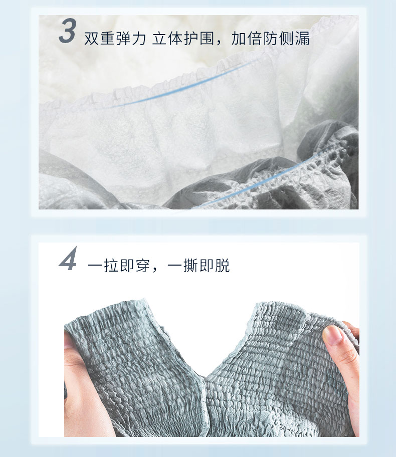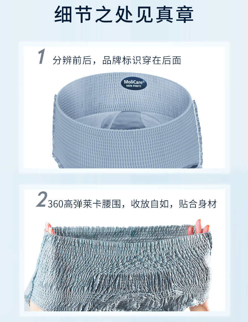 - pH5.5弱酸性保護(hù)皮膚預(yù)防失禁皮炎、三層吸收鎖定、親膚、低敏、透氣性好、速干、低調(diào)、防漏、除臭、貼合男性解剖