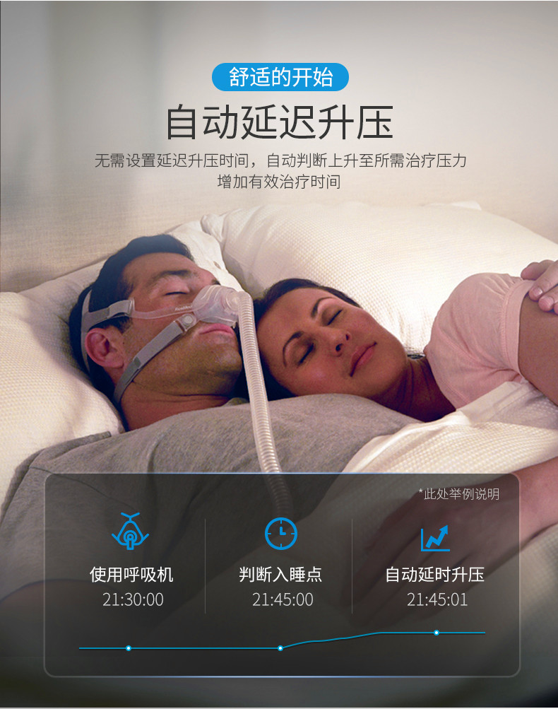 3. SmartStart?功能。 在您戴上面罩呼吸時(shí)開(kāi)始您的睡眠呼吸暫停治療。當(dāng)您摘下面罩后,該功能在幾秒鐘后自動(dòng)停止。
