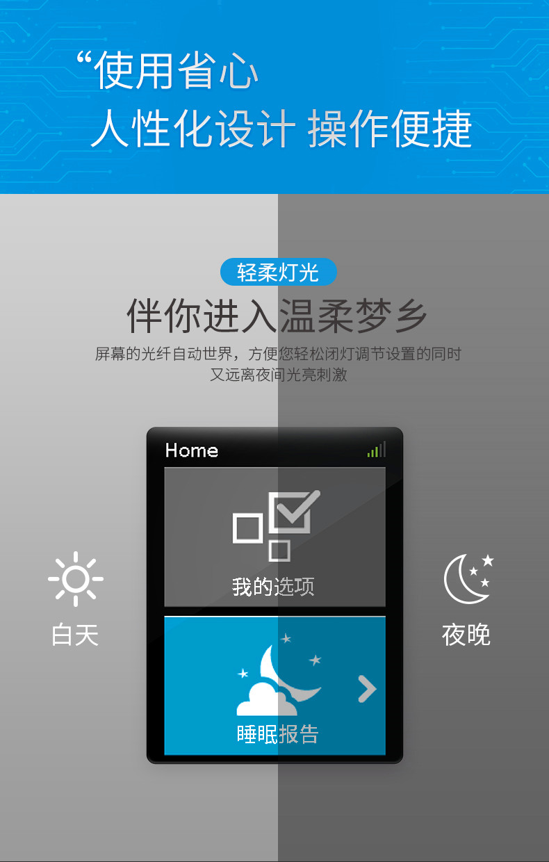 1. 內(nèi)置環(huán)境光傳感器。屏幕的光線自動(dòng)識(shí)別功能,方便您您輕松閉燈調(diào)節(jié)設(shè)置的同時(shí),又遠(yuǎn)離夜間光亮刺激。