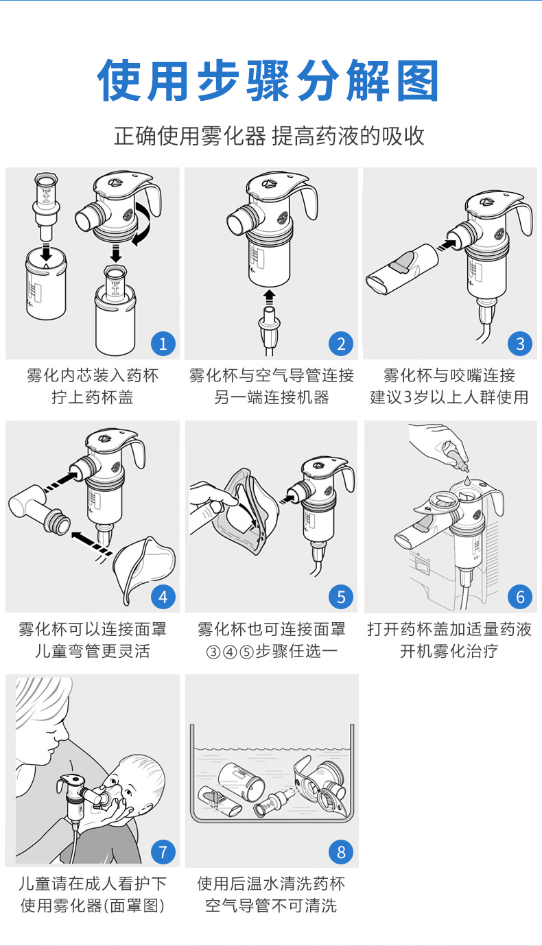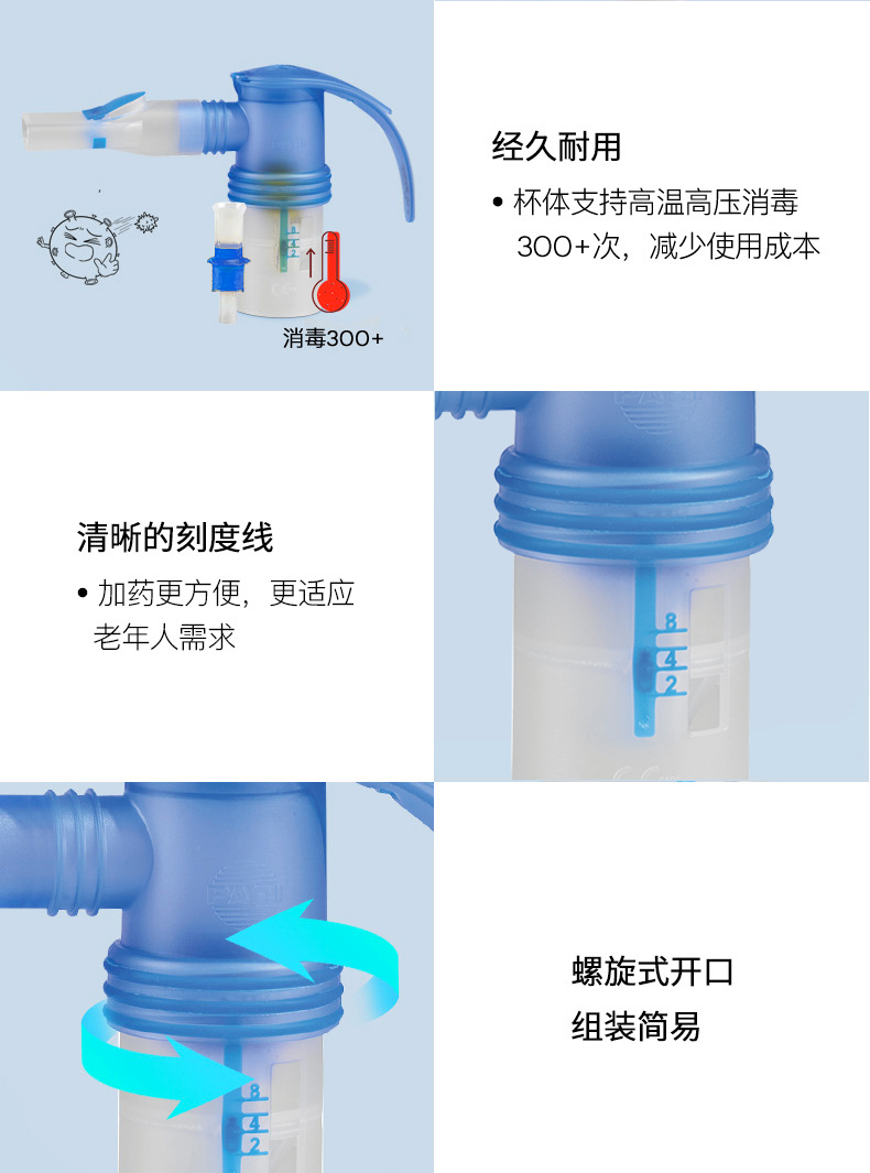 - 使用后將藥杯拆開用溫水清洗,藥杯的各個部件可以放入洗碗機進行消毒和溫水清洗,自然晾干后組裝好放在無塵干燥處保存(溫馨提示:空氣導管不能清洗)。