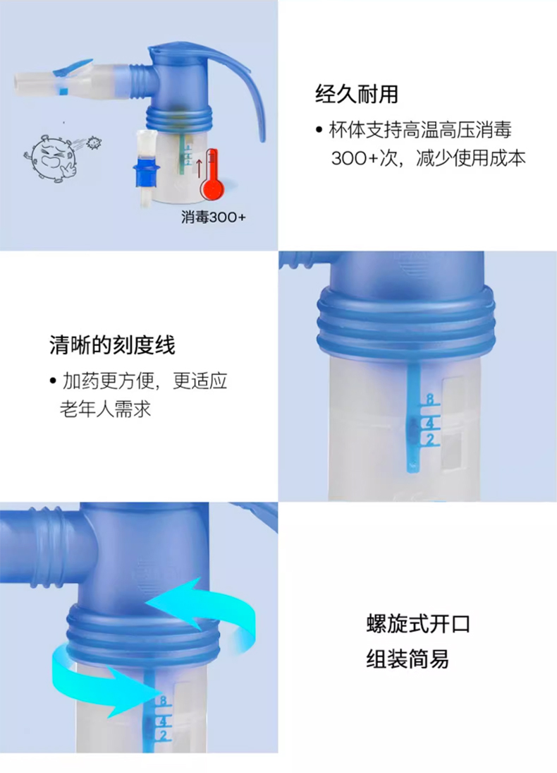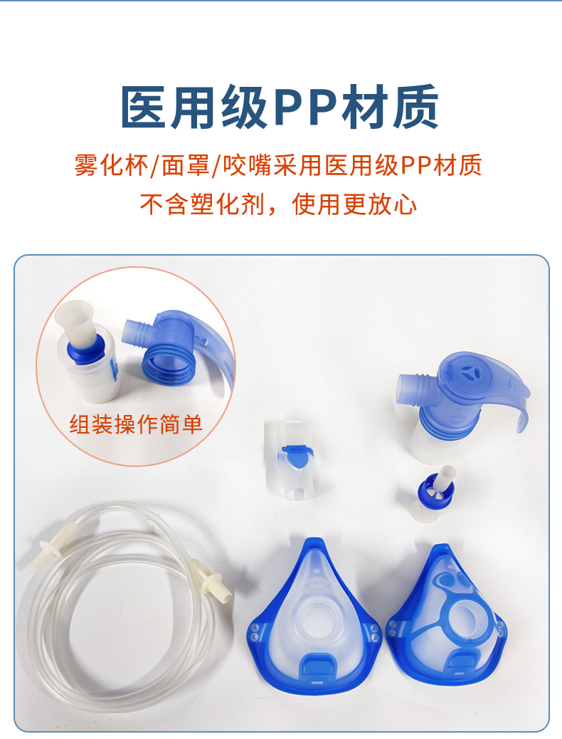 - 霧化杯/面罩/咬嘴采用醫(yī)用級PP材質(zhì),不含塑化劑,使用更放心。