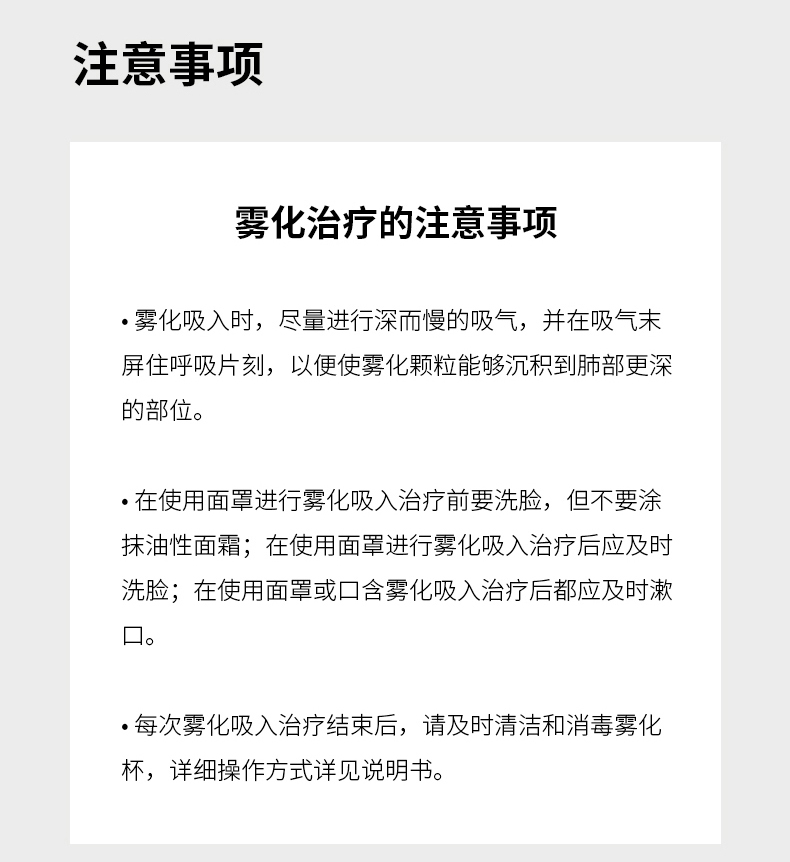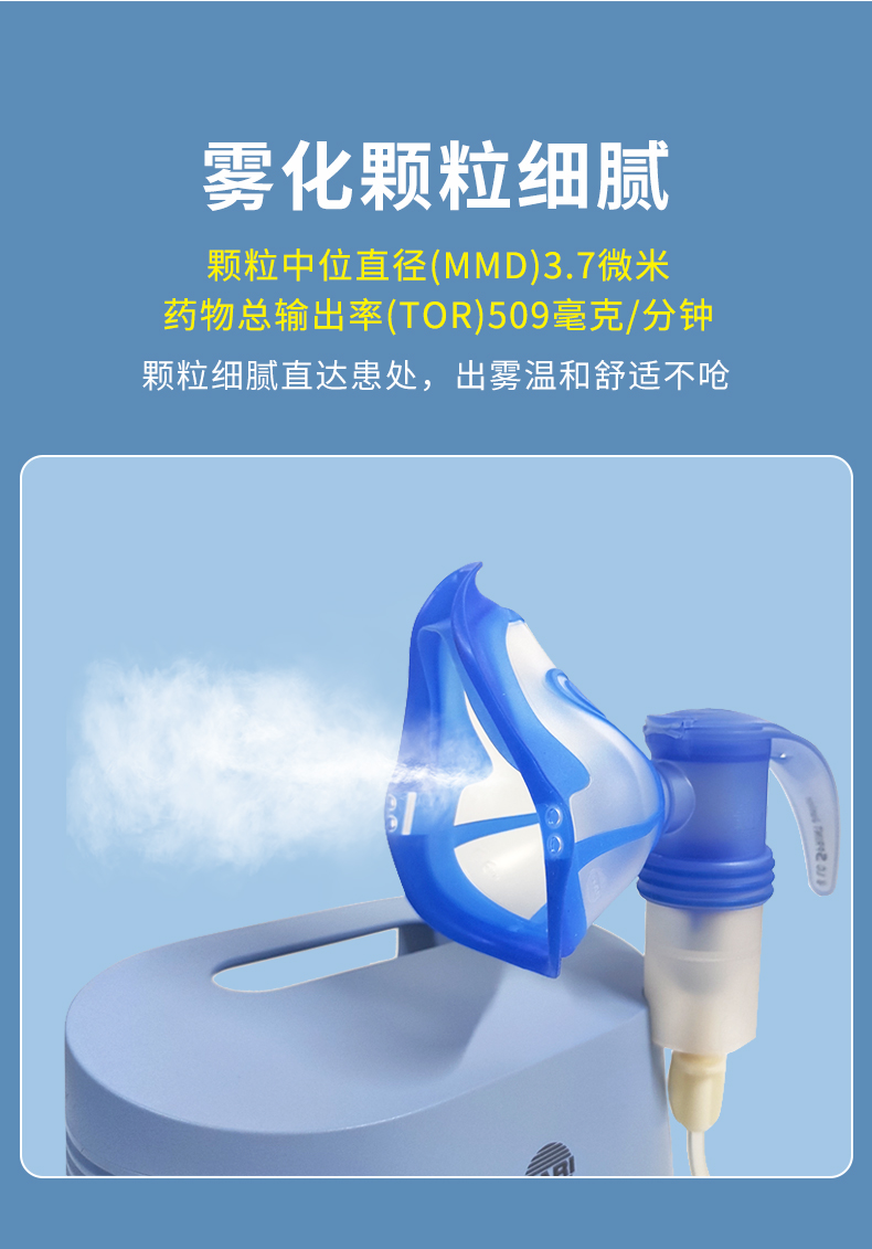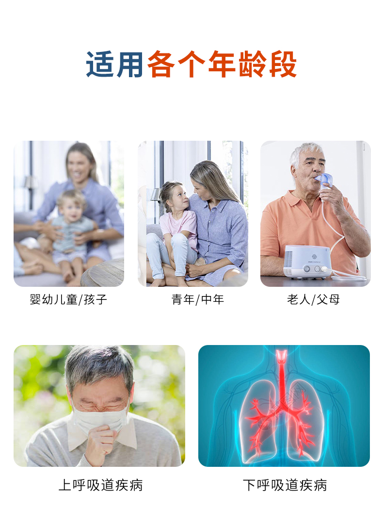 - 可適用于各個年齡段感冒、咳嗽、肺炎、支氣管炎、哮喘等下呼吸道病癥的霧化吸入治療。