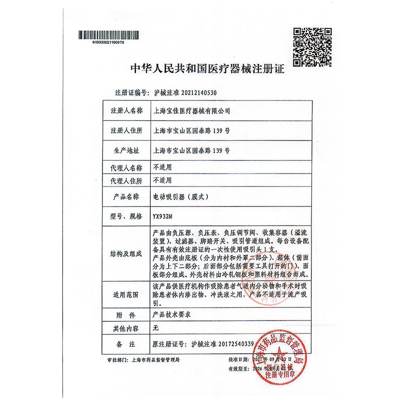 斯曼峰電動吸引器證書