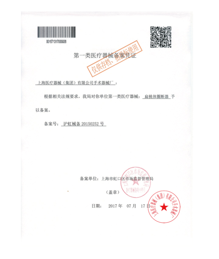 - 產(chǎn)品注冊證號:滬虹械備20150252號
