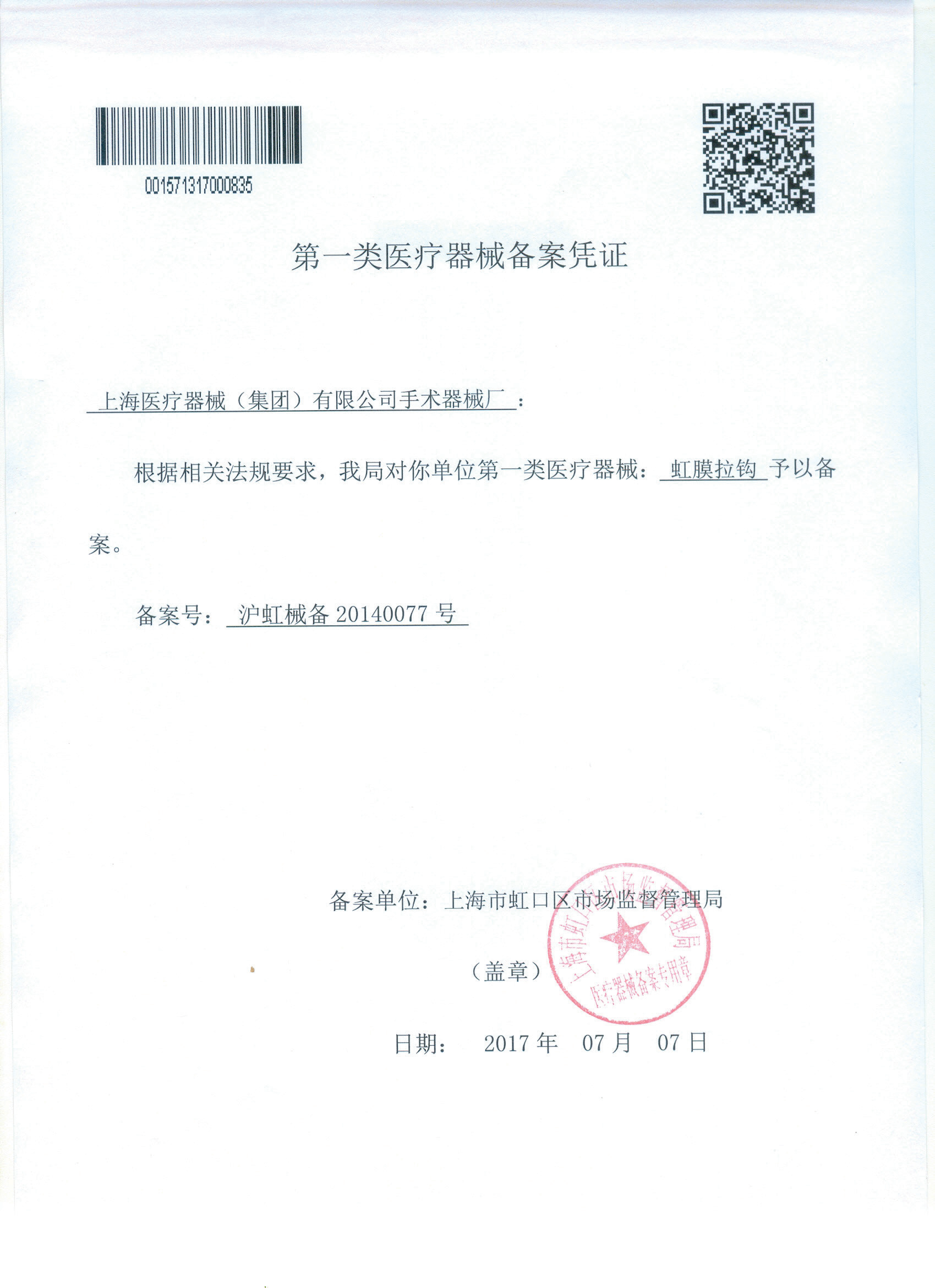 - 產(chǎn)品注冊(cè)證號(hào): 滬虹械備 20140077號(hào)