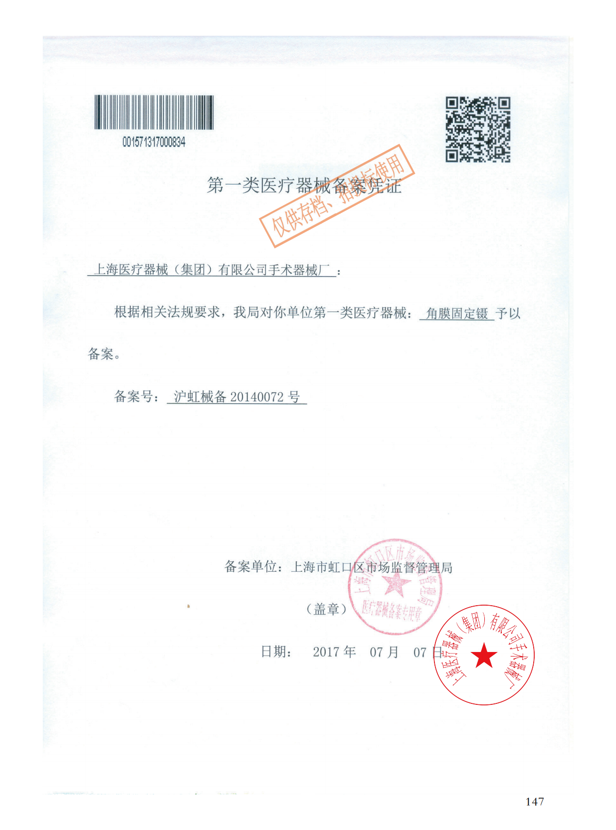 - 產(chǎn)品注冊證號:滬虹械備20140072號
