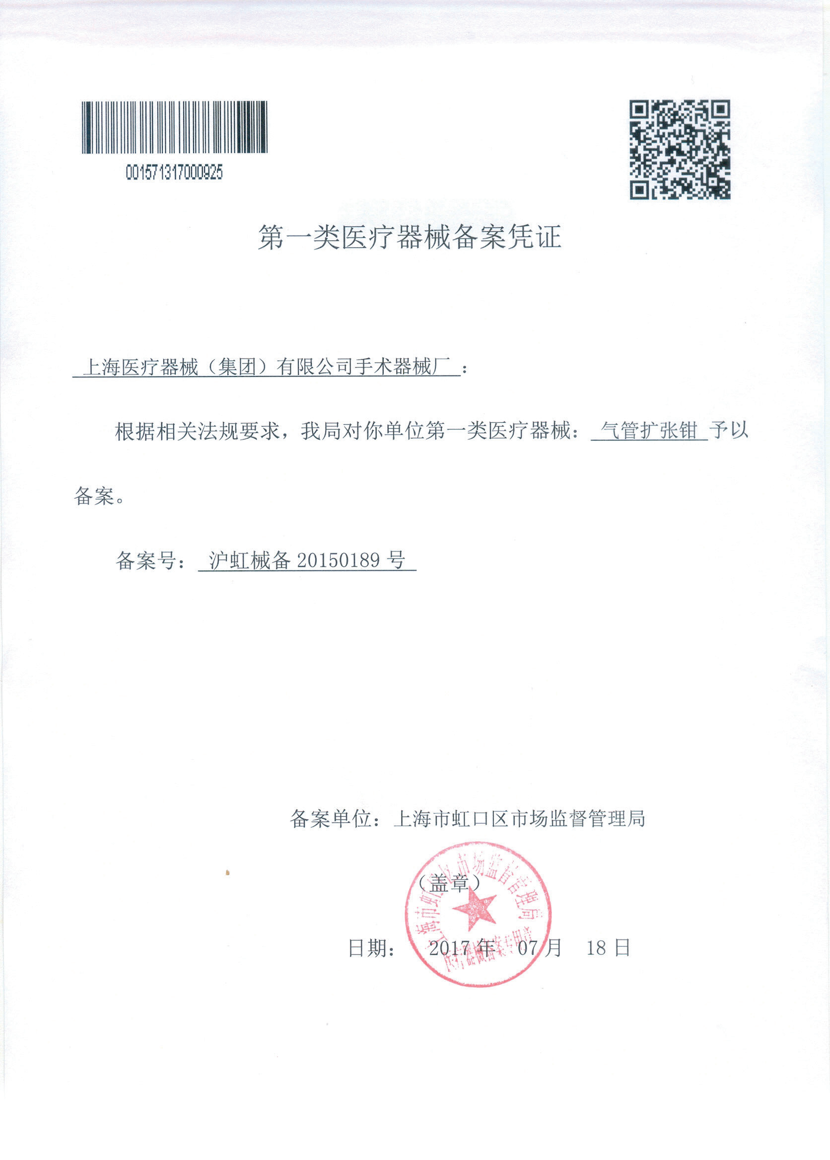 - 產(chǎn)品注冊證號(hào):滬虹械備 20150189 號(hào)