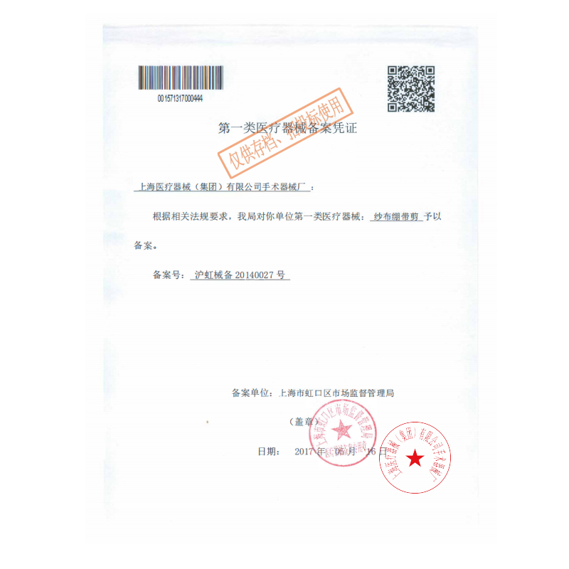 - 產(chǎn)品注冊證號:滬虹械備 20140027 號
