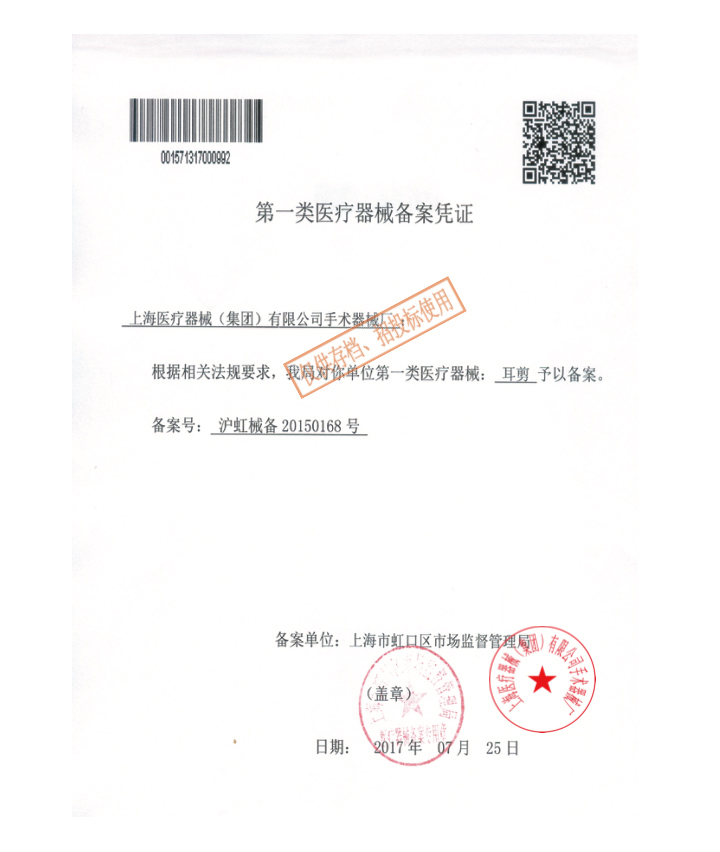 - 產(chǎn)品注冊證號:滬虹械備 20150168 號