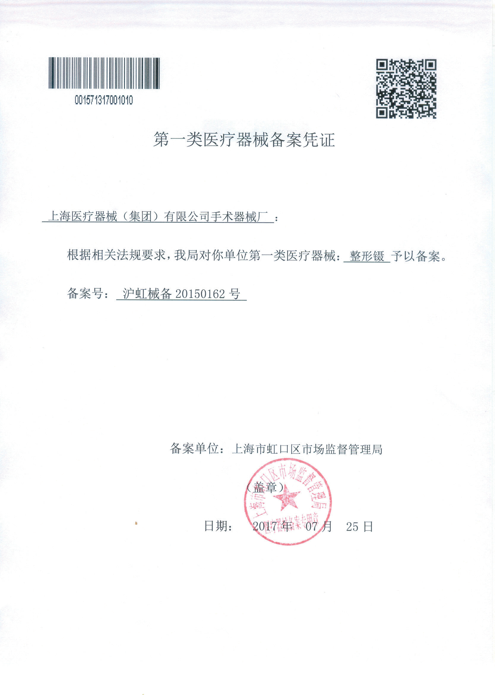 - 產(chǎn)品注冊證號: 滬虹械備 20150162號