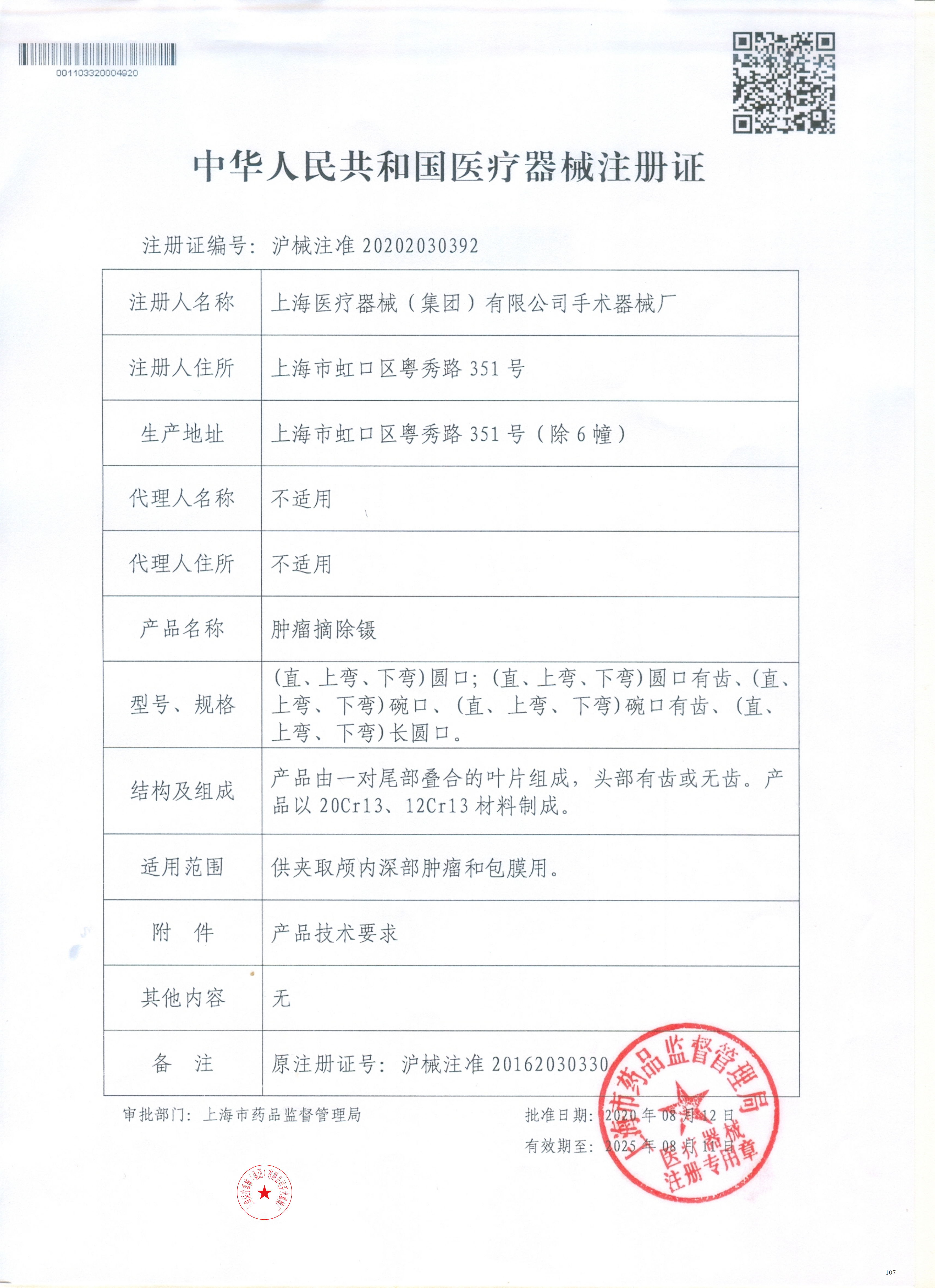 - 產(chǎn)品注冊證號:滬械注準 20202030392