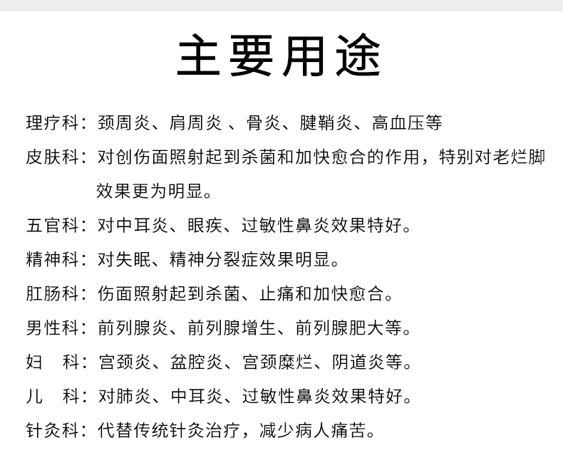 - 皮膚科:對(duì)創(chuàng)傷面照射起到殺菌和加快愈合的作用,特別對(duì)老爛腳效果更為明顯。