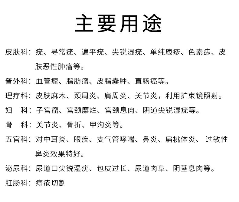 - 皮膚科:疣、尋常疣、遍平疣、尖銳濕疣、單純庖疹、色素痣、皮膚惡性腫瘤等。