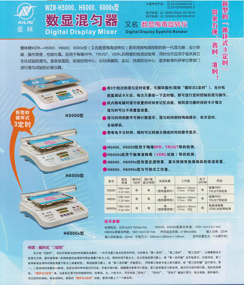 - 愛林牌WZR-H6000型(又名數(shù)顯梅毒旋轉(zhuǎn)儀)是采用微電腦控制的新一代混勻器,設(shè)計(jì)新穎,操作簡(jiǎn)便,性能可靠。應(yīng)用于梅毒RPR、TRUST的篩查和檢測(cè)試驗(yàn)等,同時(shí)也可應(yīng)用于臨床其它生化試驗(yàn)的混勻。是各級(jí)醫(yī)院、疾病控制中心、婦幼保健院、血站、性病防治中心、醫(yī)學(xué)教育科研單位等部門進(jìn)行混勻試驗(yàn)的必備儀器。