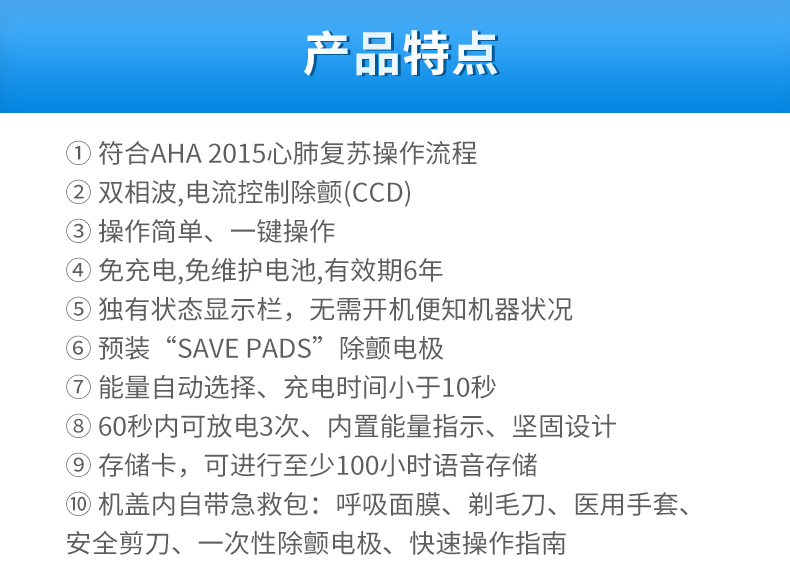 符合 ERC 2005心肺復(fù)蘇操作流程 雙相波,電流控制除顫(CCD) 操作簡單,一鍵操作,免充電,免維護(hù)電池,,有效期6年。有狀態(tài)顯示欄,無需開機(jī)便知機(jī)器狀況。 預(yù)裝“Save Pads”除顫電極 能量自動(dòng)選擇充電時(shí)間小于10秒,60秒內(nèi)可放電3次