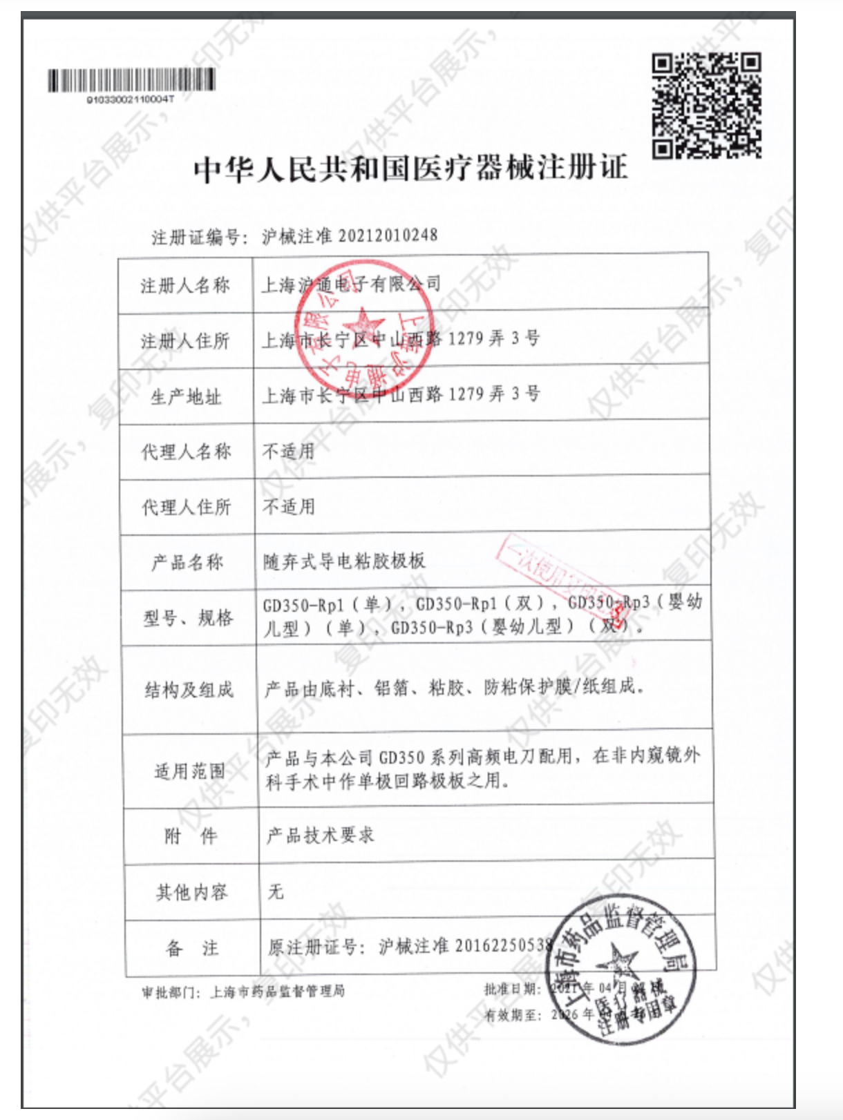 - 本產(chǎn)品適用于GD350系列高頻電刀配合,作單極回路極板之用。