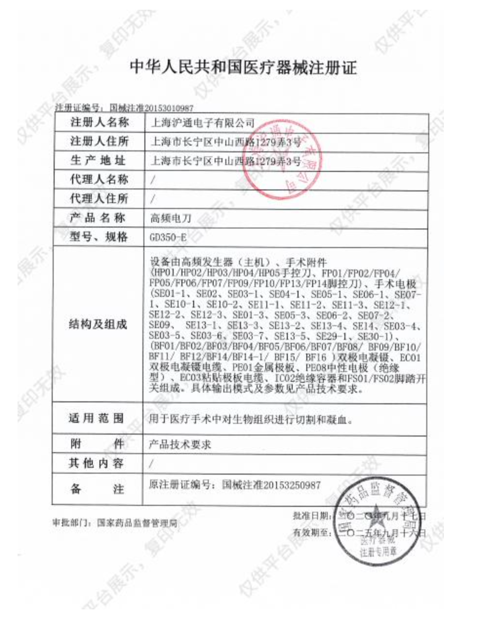 - “滬通”一直以國(guó)際化的標(biāo)準(zhǔn)來(lái)塑造自己,作為高頻電刀國(guó)家標(biāo)準(zhǔn)(GB9706.4高頻電刀專標(biāo))的起草單位,公司于2002年1月通過(guò)了IS09001和ISO13485國(guó)際質(zhì)量體系認(rèn)證,之后GD350系列高頻電刀也順利通過(guò)了歐盟CE認(rèn)證。公司擁有14項(xiàng)自主,3項(xiàng)微機(jī)系統(tǒng)軟件著作權(quán),2個(gè)上海市高新技術(shù)成果轉(zhuǎn)化項(xiàng)目。數(shù)個(gè)科研項(xiàng)目被評(píng)定為國(guó)家科技創(chuàng)新基金和上海市科技創(chuàng)新基金項(xiàng)目,公司研發(fā)的微創(chuàng)外科醫(yī)療器械的關(guān)鍵技術(shù)獲得中國(guó)機(jī)械工業(yè)科學(xué)技術(shù)二等獎(jiǎng)。生產(chǎn)的高頻電刀專用檢測(cè)設(shè)備,已被上海市醫(yī)療器械檢測(cè)所、杭州市醫(yī)療器械檢測(cè)所、北京市醫(yī)療器械檢測(cè)所、遼寧省醫(yī)療器械檢測(cè)所等國(guó)家級(jí)科研檢測(cè)單位采用。