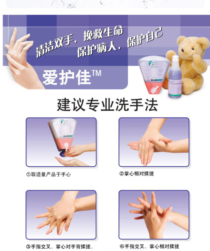 洗手:在流動(dòng)水下,使雙手充分淋濕,取適量原液,按照標(biāo)準(zhǔn)的手衛(wèi)生方法揉搓雙手,徹底沖盡、擦干。