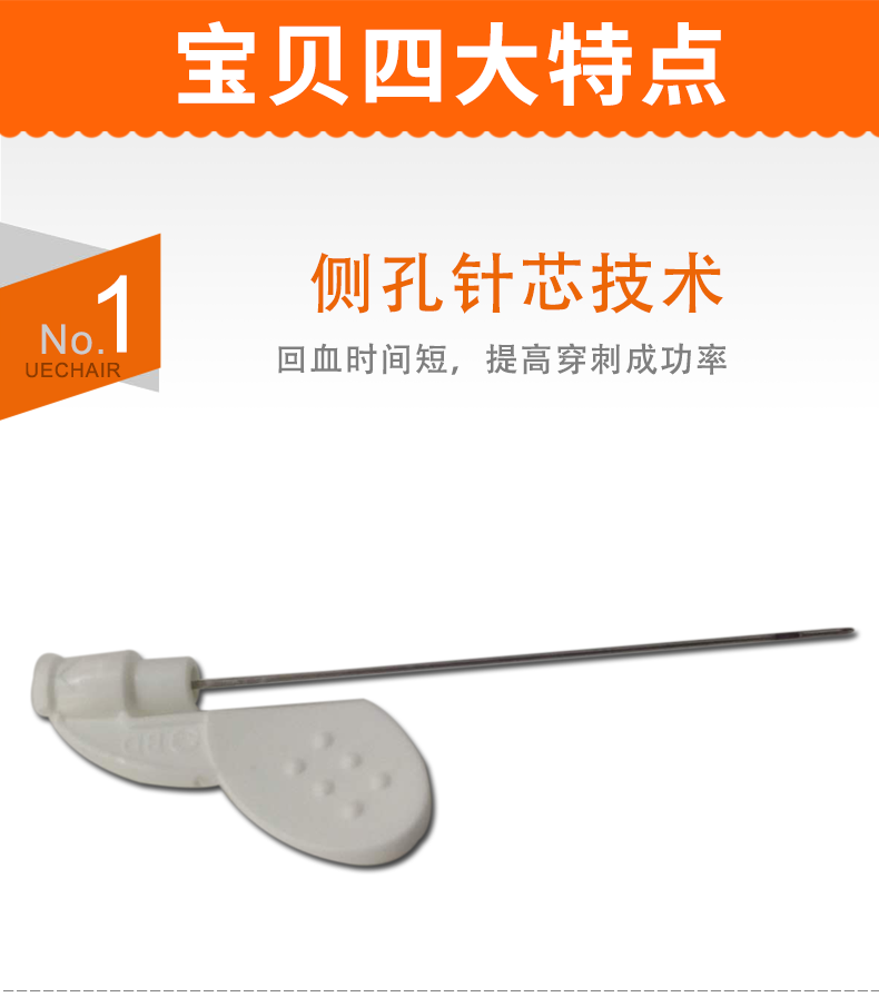 • 金屬穿刺針前端設(shè)有回血側(cè)孔,在短時(shí)間內(nèi)迅速回血,提高了穿刺成功率