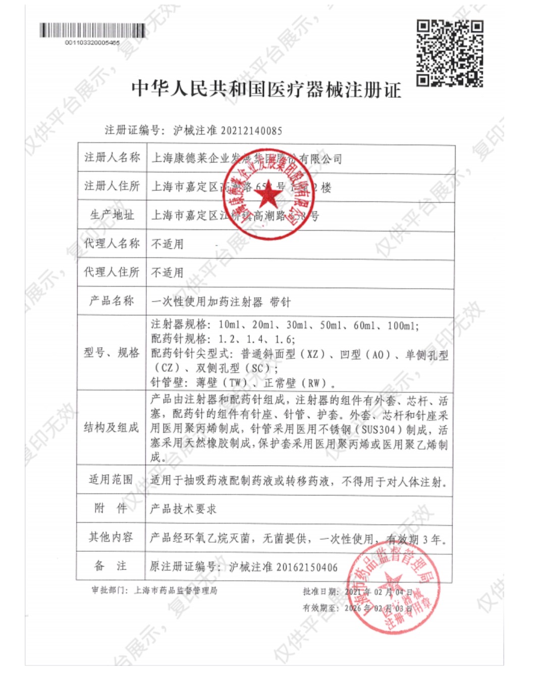 手機(jī)掃碼:康德萊一次性使用加藥注射器 30ml